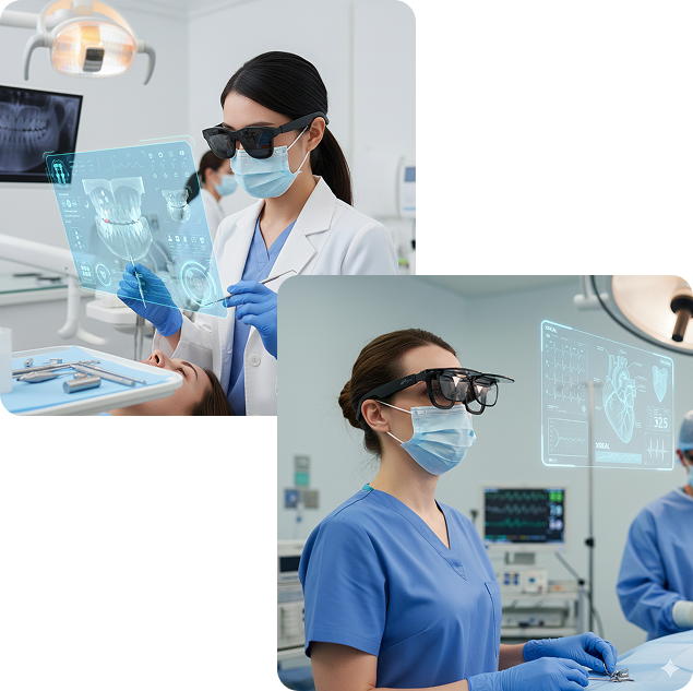 Navident is compatible with multiple Augmented Reality (AR) Glasses which will help the clinicians during surgery to view the patient jaw and the Monitor screen at the same time on the Head Gear AR Glasses .